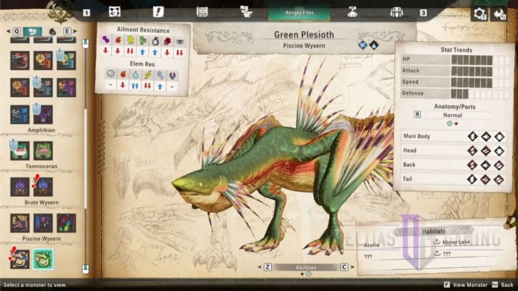 If you are hunting Green Plesioth in Azuria, the key area to focus on is Mirror Lake. Current guide coverage places Green Plesioth in Azuria: Mirror Lake, and egg-location guides also list Azuria as one of its habitats. That makes Mirror Lake the main place to search if your goal is either to fight the monster directly or farm its egg.